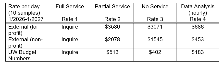 Our facility runs in a cost-recovery model with usage charges contributing to the upkeep of the facility. Seeking to keep usage rates for UW users low, we are grateful to the UW School of Medicine and the Department of Pharmacology for subsidizing instrument repair costs. Our usage rates are reviewed regularly by UW Management Accounting and Analysis and the UWSOM and are subject to change.